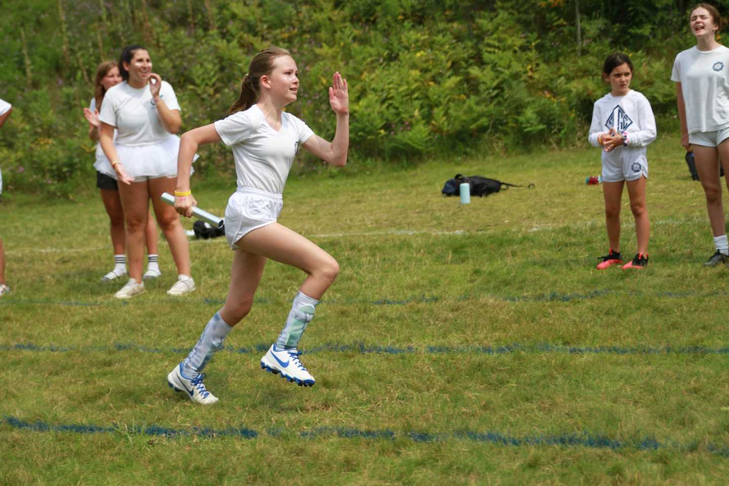 Afternoon was the much anticipated all team relay! The girls came on the fields with their blue and white gear and tons of spirit. They did not take a break from cheering on their team! The girls ran their hearts out passing the baton on and gave it their all. White at the end won with 90 points!
