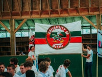 Lined up outside The Hallsband Arena, the teams wore their custom t shirts and cheered getting amped for the sing. They were scored in 5 categories, Team Banner, Entrance, Old Beauty, Old Fight, and Cheer.